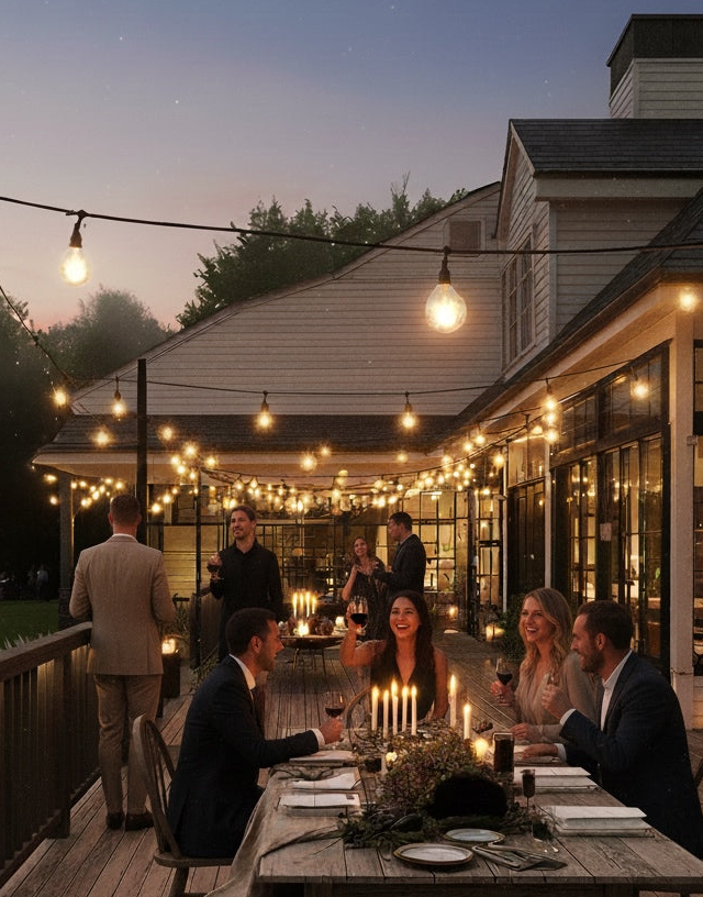 - Lighting options: string lights, bistro/café lights, pendant lights. Use a guide wire for longer runs, straighter lines, or pendants.