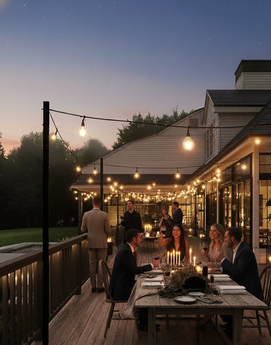 - Where it lives: Most decks look best with the light line set around 8–10 ft high. A gentle ~6" drape over a ~12' span reads clean and comfortable.