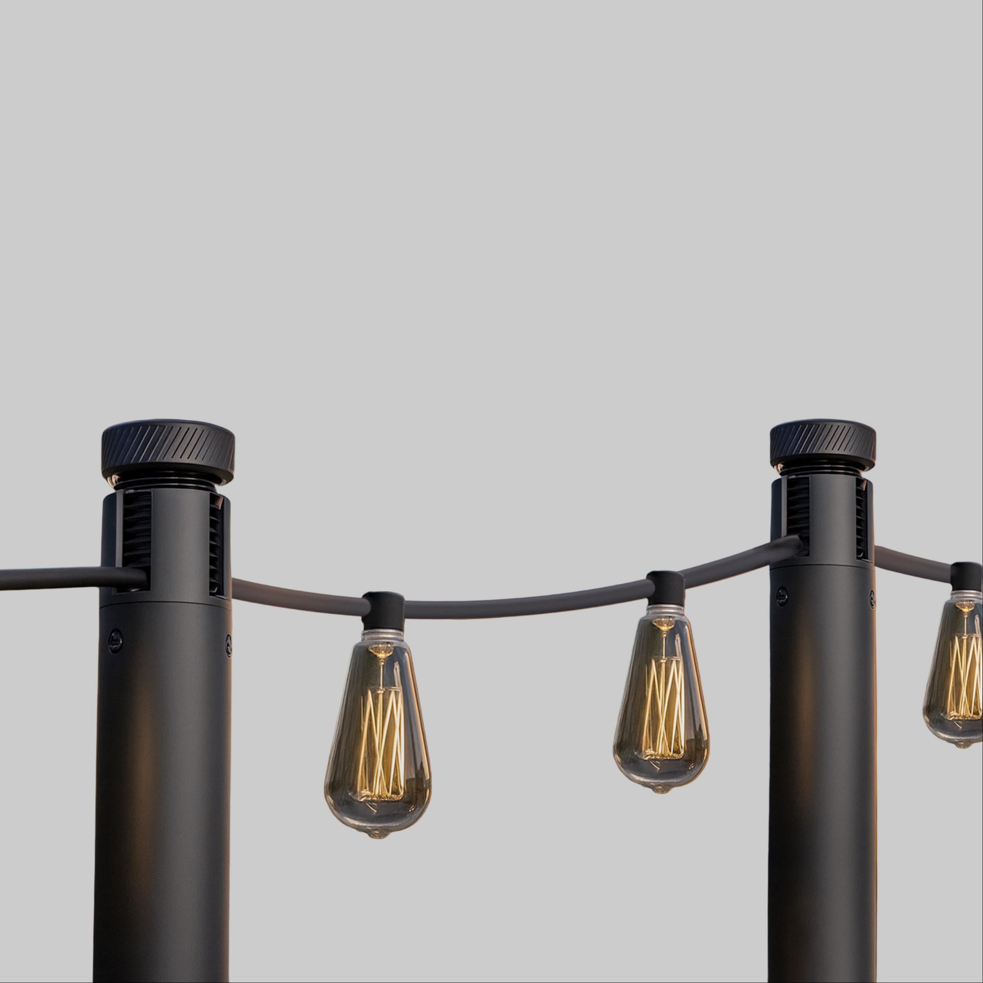 Patented compression anchors and anodized aluminum deliver a solid, contemporary lighting system that performs as beautifully as it looks — an award winning rethinking of the string light pole.