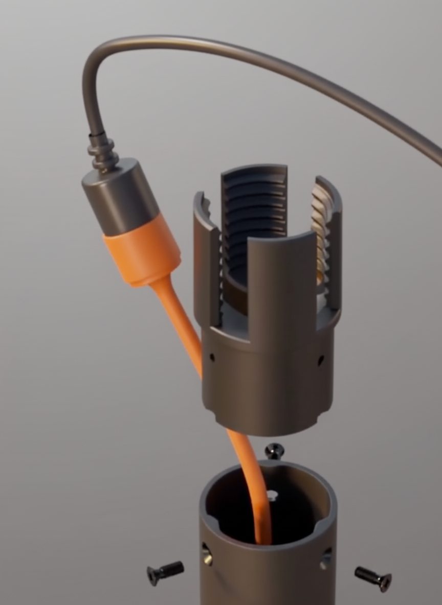 Each anchor functions like a miniature vise. Turning the screw increases compression, gripping the light cord securely and locking in tension without exposed turnbuckles or bulky hardware.